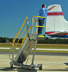 As the height changes, the work deck also self-levels, keeping a true horizontal position, no matter the height adjustment made. Without this special engineering, typical stationary steps would slant at unsafe angles, and the deck would slant as well.