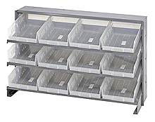 Assembly and small parts shipping becomes more effective when items can be put right on the work bench. This 12 bin and 3 shelf system allows you to work quicker at picking sterile and food grade items from 11-5/8"D x 8-3/8"W x 4"H clear view bins on a slant for easy identification and pick. Bins are FDA approved material and can be autoclaved. Bench rack measures 12"D x 36"W x 21"H.