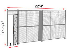 A wire mesh security partition prevents pilferage, encloses work areas, and creates customized, accessible security areas in warehouses, manufacturing facilities, distribution centers, tool cribs, and other work areas. It gives you control of who has access to valuable inventory. The hardware is inaccessible from the exterior, so it can't be easily disassembled from outside the cage. Installation is fast because the design uses a minimum of parts. The panels are constructed of 8 gauge vertical and 10 gauge horizontal wires welded into 2" x 2" center to center square rectangular mesh and secured to a 1¼" x 1¼" steel angle frame on all four sides. Doors include cylinder key locks, other lock options are available.