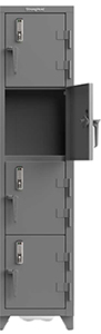 Constructed from heavy-duty 14 gauge all-welded steel, this personal storage locker is a durable, reliable, and versatile storage system. The four compartment stacked design provides convenient space saving storage. Security is a top priority with the inclusion of a cast steel keyless entry lock system. The locker can be anchored to the floor using the easy access floor mounting system, adding an extra level of security. Locker ships fully assembled and includes a 25 year warranty.